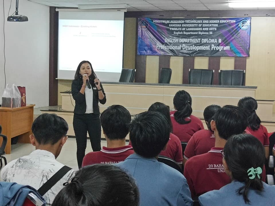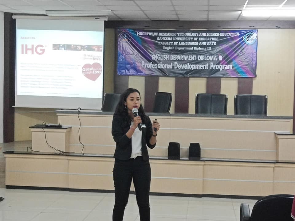 Team IHG) yang super duper attraktif dan informatif datang ke kampus kami. Pembicara kunci Ibu Gusti Ayu Dwi Susanti, Learning and Development Coordinator, hotel Holiday Inn Baruna Bali, bersama team dari Intercontinental Hotel dan Holiday Inn Express memberikan informasi tentang IHG dan pengetahuan untuk bisa berkompetisi dalam persaingan dunia kerja di bidang perhotelan. Terima kasih team IHG, semoga kerja sama ini bisa terus ditingkatkan.