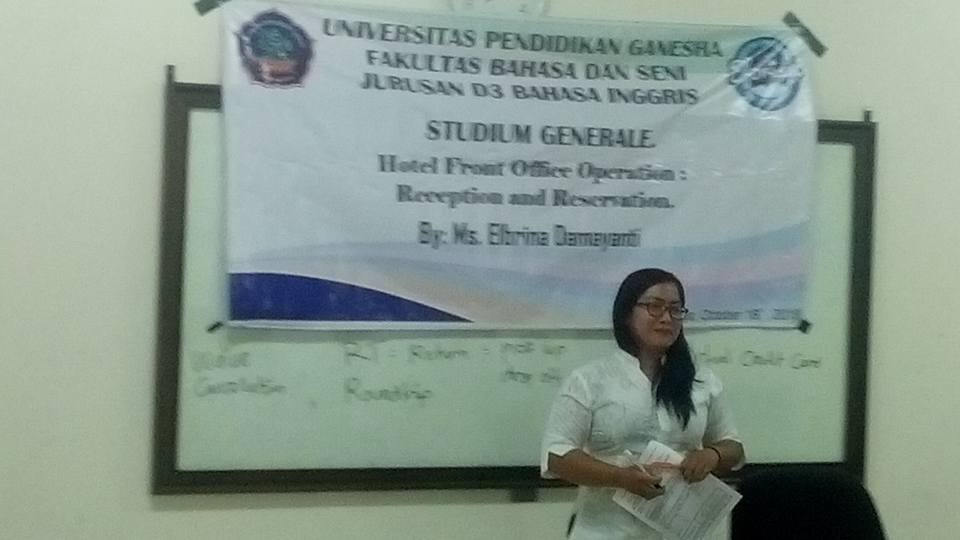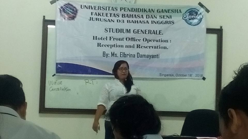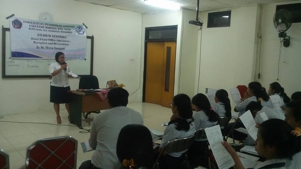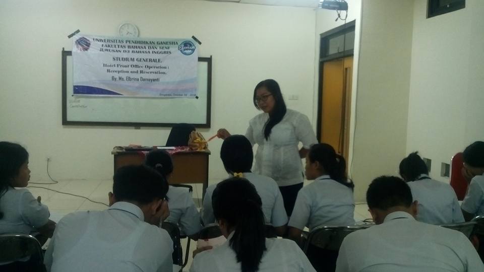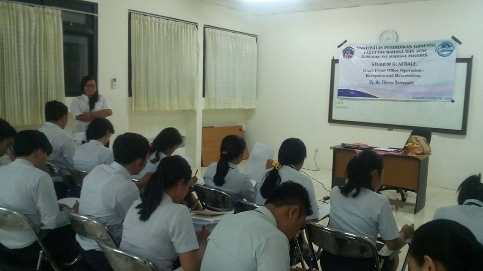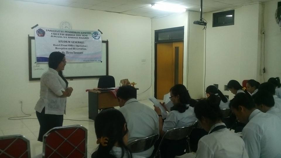 D3 Bahasa Inggris Undiksha update: pengajar tamu dari The Lovina Hotel, Ibu Elbrina damayanti , dengan sangat detail dan telaten melatih mahasiswa kami berbagai keterampilan di bidang reception, reservation, sale marketing dan e-commerse, terima kasih Ibu Elbrina.